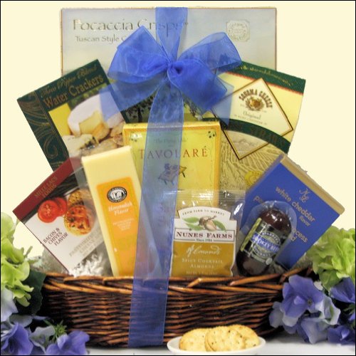Show them you are thinking of them with this tasty gourmet cheese gift basket. It offers a nice assortment of gourmet cheeses, crackers, nuts, and snacks. Includes Bacon, Cheddar & Chive and Horseradish Cheese Spreads and Tavolare Savory Snack Mix.