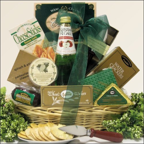 Offer them some Tempting Cheese Delights with this wonderful gourmet cheese gift basket. It is filled with a nice assortment of cheeses, crackers, meats, nuts, snacks and a non-alcoholic sparkling pear juice. Even includes a wooden handled gift boxed cheese knife for them to keep well after the gourmet goodies are gone.