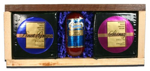 This Cheese and Sausage Gift Box from Northwoods Cheese Company has some unique cheese and sausage taste treats for your Dad. The hottest new wine flavors to hit the market. The Gift Box includes 1 6 oz. pasteurized process cheese product Shiraz Wine Cheese, 1 6 oz. pasteurized process cheese product Pinot Grigio Wine Cheese and 1 3oz. Bavaria Sausage Salami packaged in a reusable wooden box that is 10.5 in. x 4.5 in. x 2.25 in. This item ships to APO addresses. On rare occasions, or during warm weather, a product of equal or greater value may be substituted if a listed product becomes unavailable or is unsuitable for shipping.