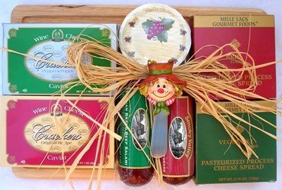 The air is crisp, the leaves are changing and people everywhere are ready to start snacking. Yes its fall and what would autumn be without the traditional sampling of cheese, crackers and summer sausage? This gift arrangement includes a healthy sampling of these popular snack food favorites, along with a durable bamboo cheese spreader, all arranged on a wooden cutting board!