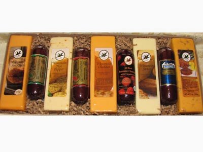 Supreme Cheese and Sausage Gift Box includes an outstanding variety that is sure to please anyone. This Supreme Cheese and Sausage Gift Box is a superb selection for tailgate parties, holidays, or even everyday snacks. This gift box contains generous cuts of Wisconsin pasteurized process cheese food and summer sausage. Enjoy Wisconsin Cheddar Bar, Swiss Bar, Garden Smoky Bar, Salami Cheese Bar, Hot Pepper Bar, Beef Summer Sausage, Beef Salami and Cranberry Summer Sausage. Celebrate! This product is shipped in its ready-to-ship gift box, with no other packaging required. The shipping label is affixed to the gift box.